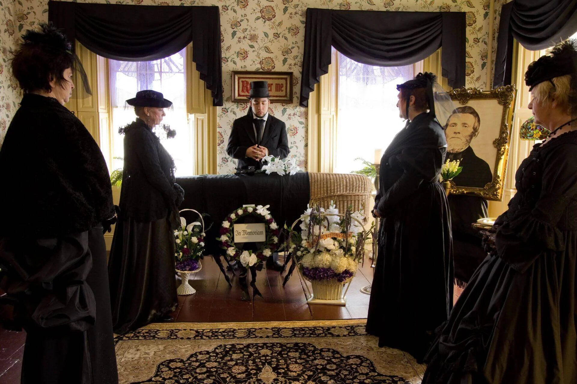 Hearthside re-creates the Victorian mourning customs practiced during the time when Simon Thornton passed away, with displays in each room of the house that include mourning clothing, mourning clothing, jewelry, artwork, stationery displays, post mortem photography, and other funerary exhibits. To kick off the inaugural exhibit in 2012, a funeral ceremony was featured, complete with an 1868 hearse.