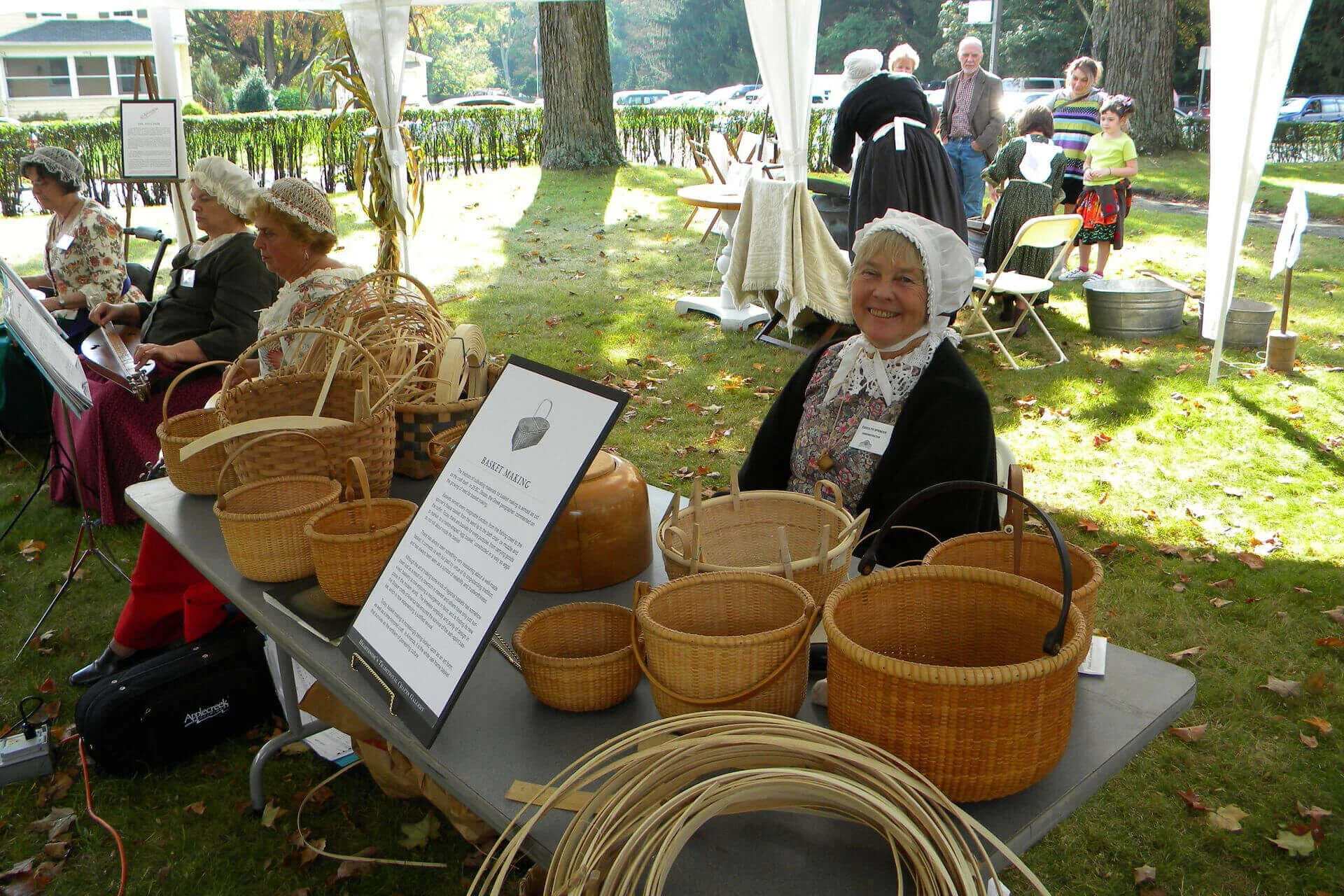 Focusing on the forgotten crafts and chores of long ago, Hearthside has sponsored events featuring demonstrations of weaving, quilting, basket making, spinning, embroidery, stained glass, use of herbs, silhouettes, gravestone etching, stenciling, rug hooking, rope making, cooking over the open fire, washing clothes in a washtub, and blacksmithing. A country stand with hot apple crisp and hot cider on a cool fall day, provided a popular family day. An old-fashioned Spinning Frolic in 2012 featured a contingent of spinning wheels and sheeps’ wool on the front lawn of Hearthside, while Celtic tunes played by local musicians provided rhythm and relaxation for the spinners on a summer day.
